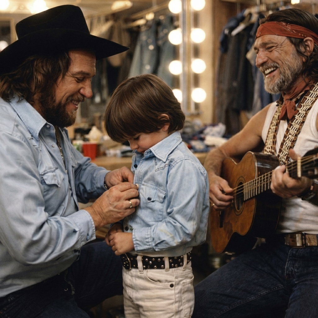 One night, while the grown-ups prepared for another roaring crowd, the room behind the stage felt almost still. A loose button had come undone on Shooter Jennings' shirt. Instead of calling for help or tossing the shirt aside, Waylon Jennings sat under a dim light and fixed it himself. The same hands that had gripped guitars, microphones, steering wheels, and years of hard living moved with care through thread and fabric.